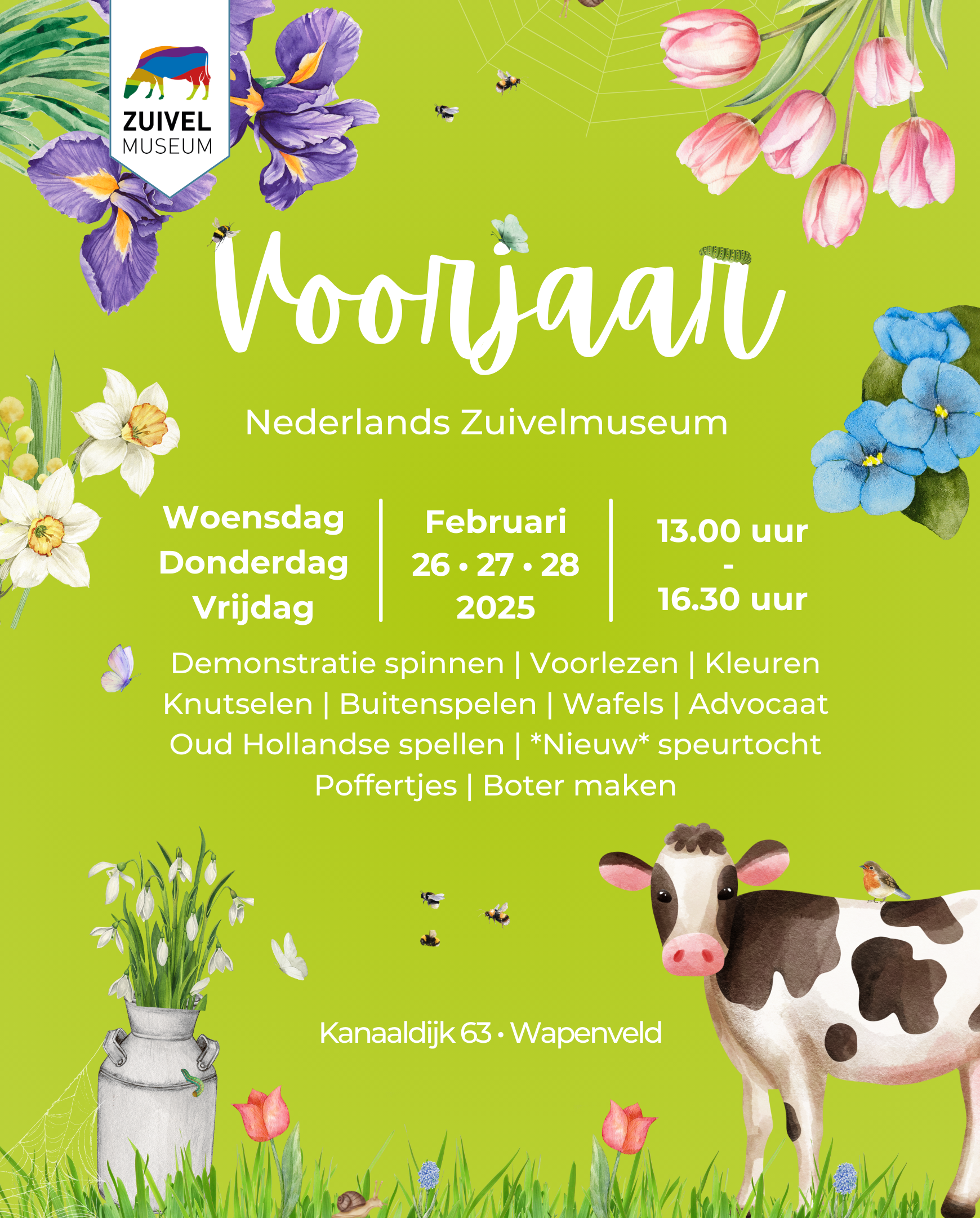 Tijdens de voorjaarsvakantie opent het Nederlands Zuivelmuseum van woensdag 26 tot en met vrijdag 28 februari 2025 haar deuren voor een voorjaarsevenement. Bezoekers zijn welkom van 13.00 uur tot 16.30 uur.